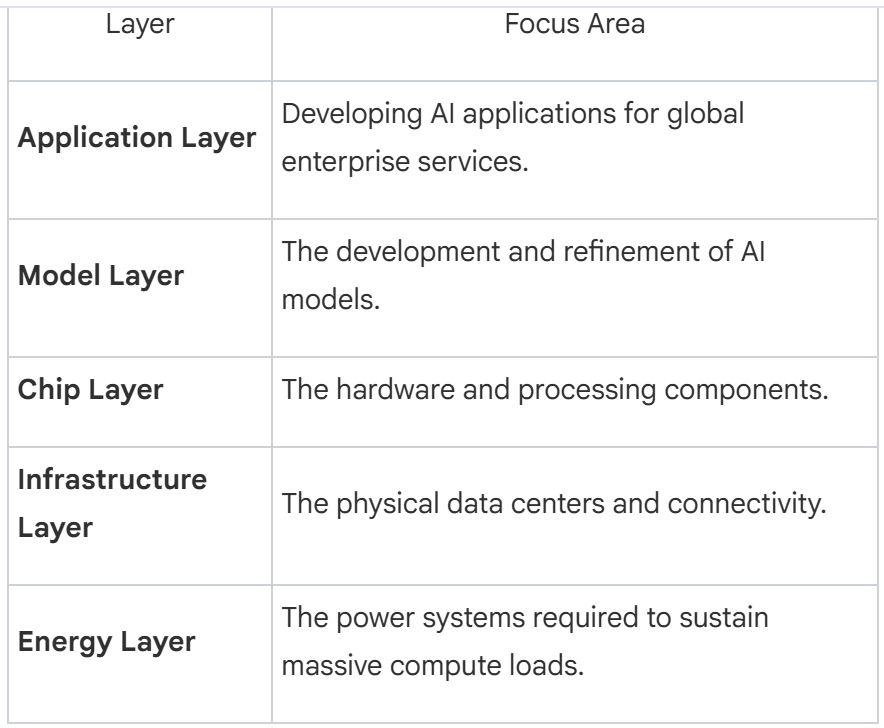 India’s “strategic AI architecture” is often described (by MeitY Minister Ashwini Vaishnaw) as 5 layers: Applications → Models → Chips → Infrastructure → Energy.